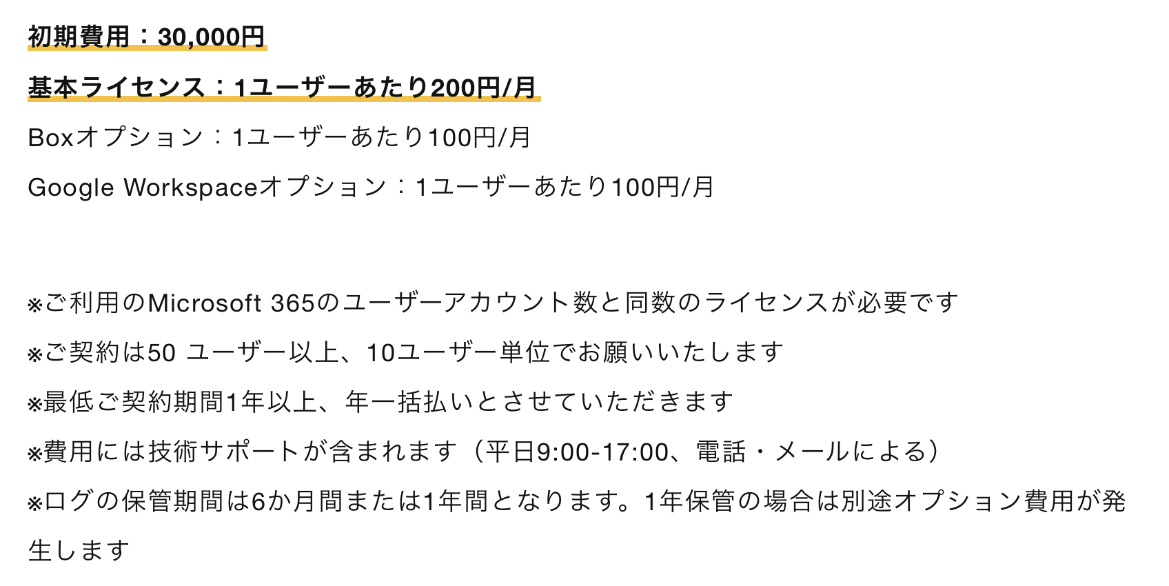 初期費用:30,000円/月額:1ユーザーあたり200円(最小50ユーザーから)※オプション:Box・Google Workspace 各100円/人。契約は1年単位・年一括払い。
