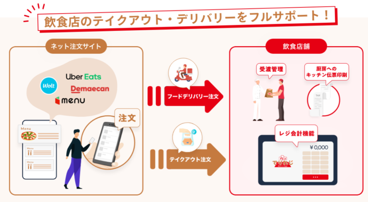 でりれじは、飲食店のデリバリー・テイクアウト・店内注文を一元管理するオールインワンPOSレジシステムです。出前館・UBER EATS・menu・Woltなど複数のフードデリバリーサービスに対応し、注文受信から伝票出力、会計処理までを一括で自動化。さらに自社注文サイトや電話注文、POS機能との連携により、注文チャネルを問わず効率的に管理可能。キッチン連携やキャッシュレス決済端末にも対応し、飲食業務の負荷軽減と省人化を実現します。