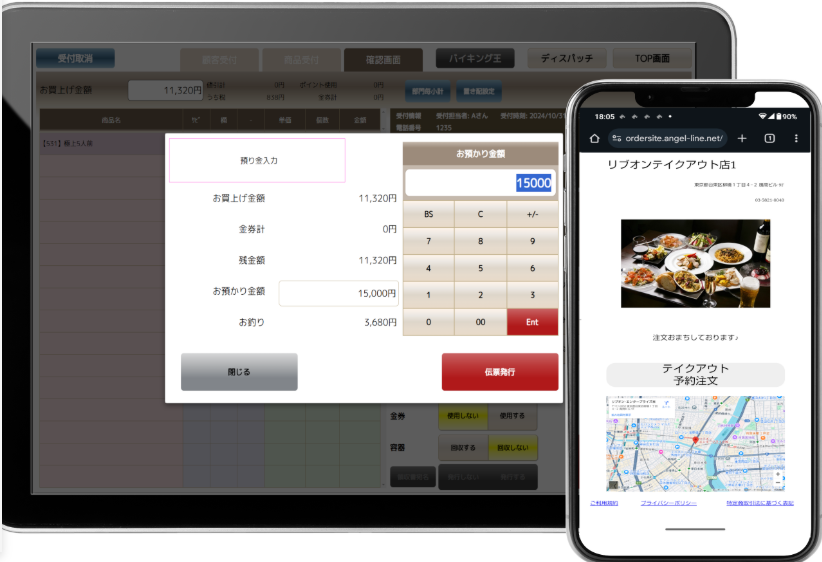 自社テイクアウトサイトと連携することで、スマホ・PCからの注文受付にも対応。注文が入ると音声とポップアップで通知し、スムーズな受注処理が可能になります。マスタデータの共有により、設定の手間も最小限に。さらに、モバイル型キャッシュレス決済端末との連携で、配達先での対面決済にも対応。飲食店の運用を多角的に支える機能が揃っています。
