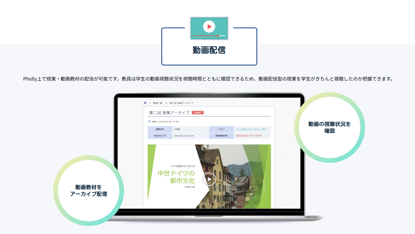 Phollyには、多数の動画配信サービスオプションがあり、オンデマンド配信された教材を使って学生が時間や場所を選ばず効率的に学習することができます。