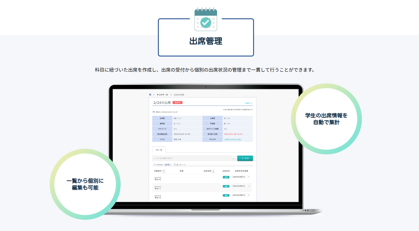 Phollyなら科目に紐づいた出席を作成し、出席の受付から出席状況の管理まで一貫して行うことができます。IPアドレスの制限設定などによって不正な出席の抑制も可能です。
