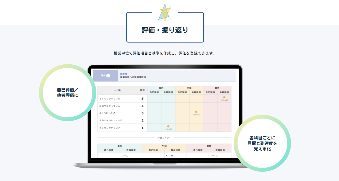 学生ごとの学習データをまとめて管理し、目標設定から評価までを一貫してサポートします。講義単位で評価項目や基準を設定できるため、細かな進捗管理を実現します。ルーブリック表やレーダーチャートを用いて自己評価と他者評価の比較も可能です。