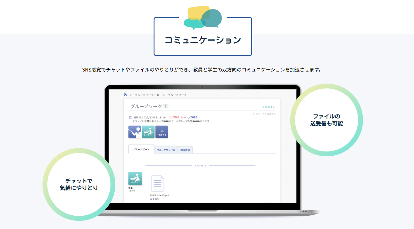 また、学習記録の蓄積や総合的な評価、チャット機能など、多種多様な機能を備えており、教員と学生の双方にとって利便性の高いツールです。