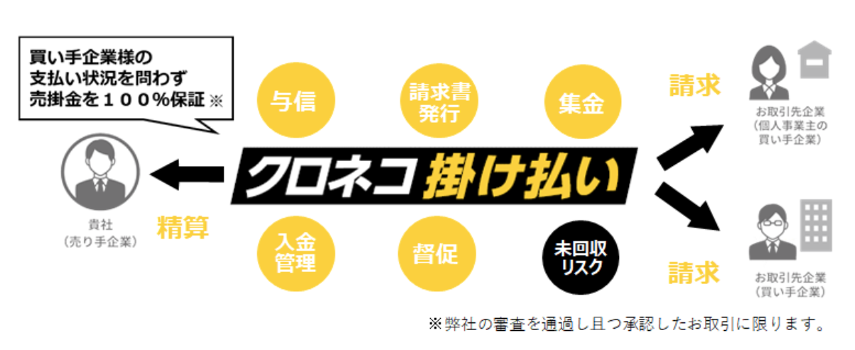 クロネコ掛け払いは、企業間の請求業務を一手に引き受けるBtoB決済サービスです。与信から請求書発行、集金、入金管理、督促までをヤマトクレジットファイナンスが全て代行。未回収リスクも完全にカバー。