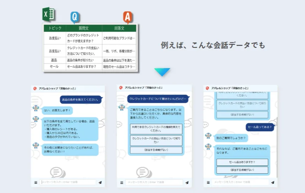 Excelの専用テンプレートに「質問」と「回答」を貼り付けて登録するだけで、高い応答率と回答到達率を実現できるチャットボットが作成できます。導入直後から効果を実感できます。