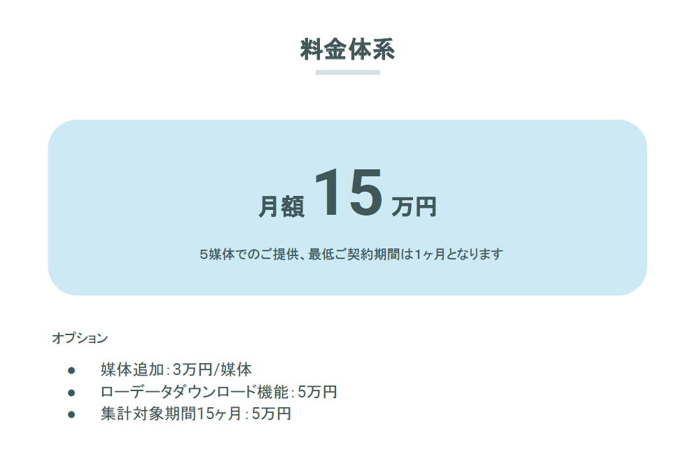 月額15万円〜。ショット契約(1ヶ月〜)可。無料トライアル(1週間)あり。利用規模・用途に応じたカスタマイズ見積対応。