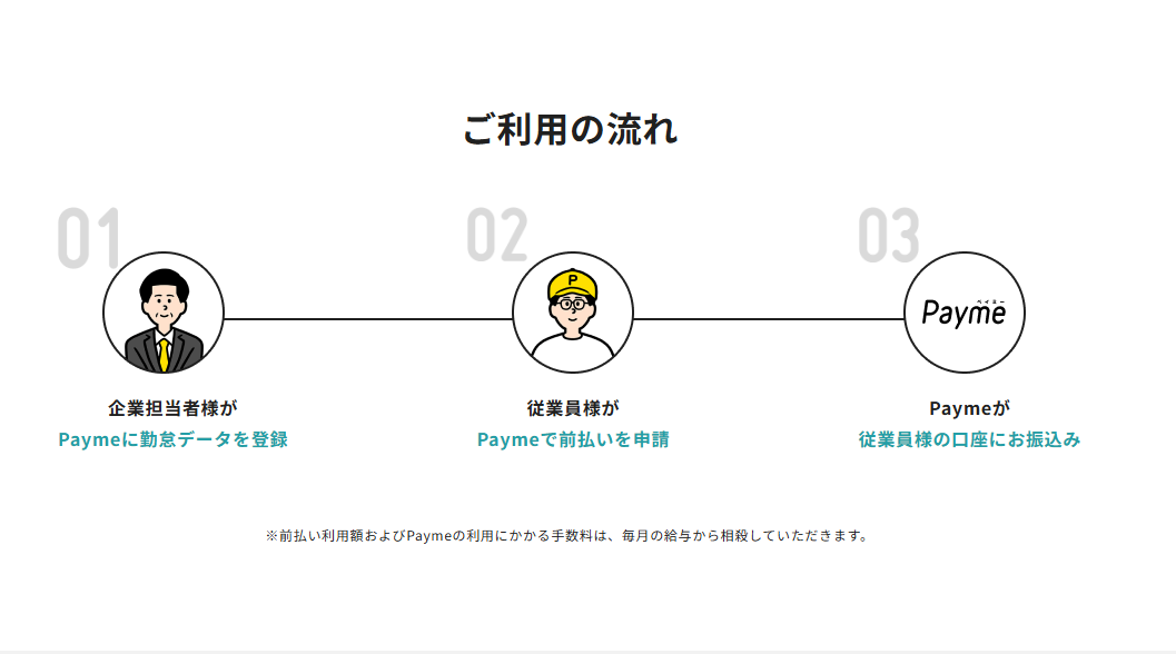 Paymeは、従業員が「今すぐ必要な生活費」や「急な出費」に対応できる、給与即日払いサービスです。従業員は、スマートフォンで申請するだけで、勤務実績に応じた給与を即時に受け取ることが可能。導入企業は、採用力強化・定着率向上・従業員満足度アップに繋がる施策として活用でき、事務作業も最小限。給与支払いのタイミングを柔軟にすることで、企業と従業員双方の新しい働き方を支援します。