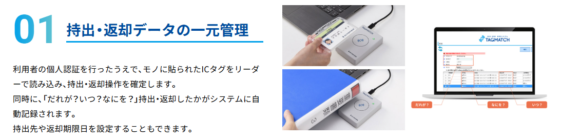 TAGMATCH(タグマッチ)は、ICタグ(RFID)を用いてモノの持出・返却・棚卸管理を一元化できるシステムです。書類・鍵・機器・パソコンなど「なくしてはいけないモノ」にICタグを貼り、リーダーで読み取ることで、誰が・いつ・何を持ち出したかをリアルタイムで記録。さらに、棚卸作業もハンディリーダーやBluetoothリーダーで一括読み取り可能。ゲート連携で不正な持出を自動検知することもでき、セキュリティと効率を両立する管理ツールです。