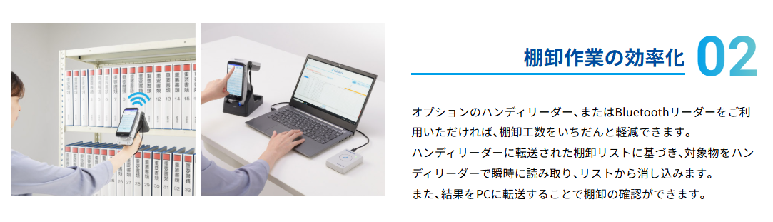 ICタグ(UHF帯)対応。ハンディリーダー・Bluetoothリーダー対応。ログインはICカード認証。クラウド型/オンプレミス型ともに構築可能。Windows環境推奨。