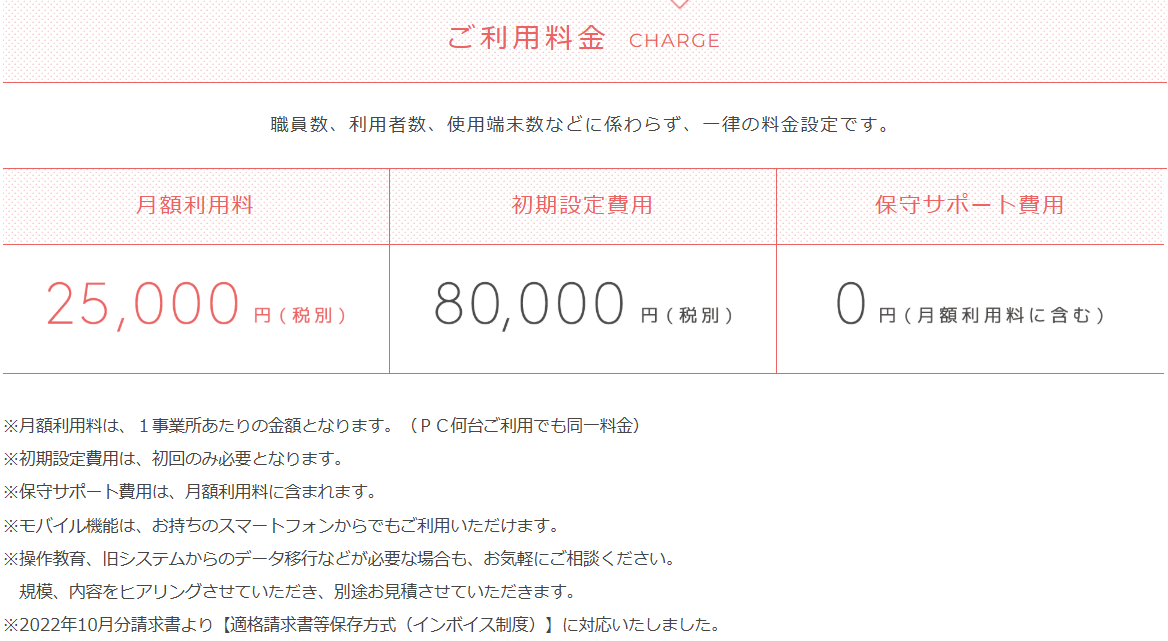 月額利用料 27,500円+初期設定費用 88,000円(税込)。ライセンスは1事業所単位で、職員数やPC・スマホの台数、利用者及び訪問数での追加料金はありません。保守・サポート料は月額に含まれ、法改正対応費も無償対応。