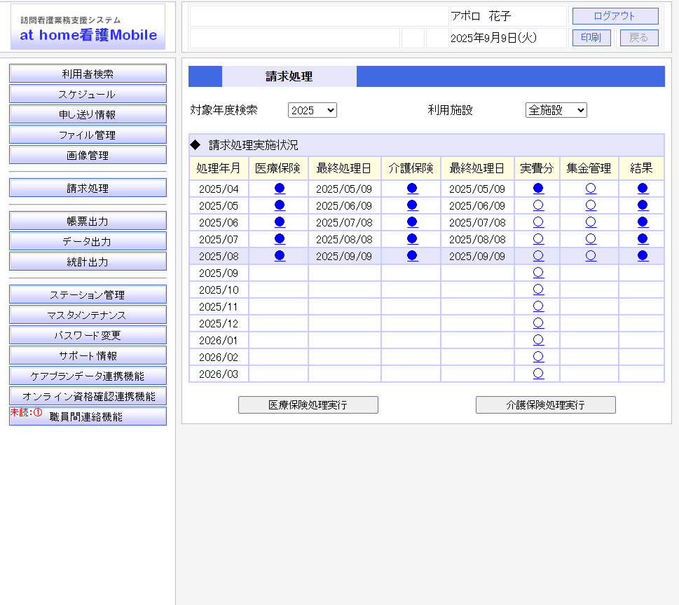 医療保険、介護保険、自費での訪問の請求に対応しています。保険請求は日々の看護記録から集計しますので、レセプト作成のために新たにデータ入力をする必要はありません。