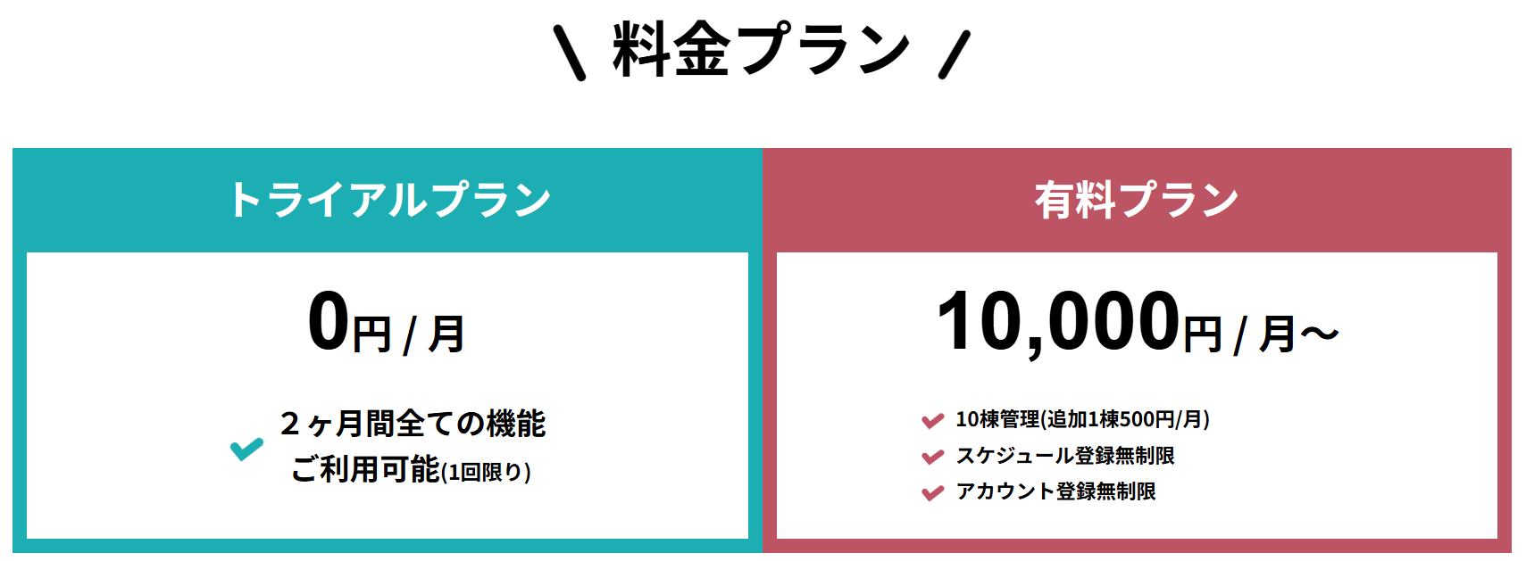 トライアルプラン:0円/2ヶ月、有料プラン:10,000円/月〜(10棟管理、1棟追加ごとに500円/月)
