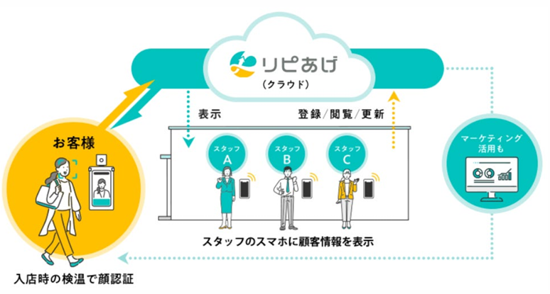 「リピあげ」は、顔認証により来店時に顧客情報を即座にスタッフへ通知し、誰でも一貫した質の高い接客を実現できる顧客管理・接客支援クラウドサービスです。専用端末不要でスマホやiPadがあれば導入可能。顧客の来店履歴や嗜好に応じた声掛けや提案が可能で、属人化しがちな接客品質の標準化と向上を支援します。複数拠点間での情報共有もリアルタイムで可能。従業員評価や業務効率化にもつながります。