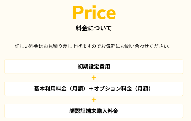 初期設定費+月額基本利用料+オプション利用料(要問合せ・見積)。顔認証端末は別売。補助金活用可能。