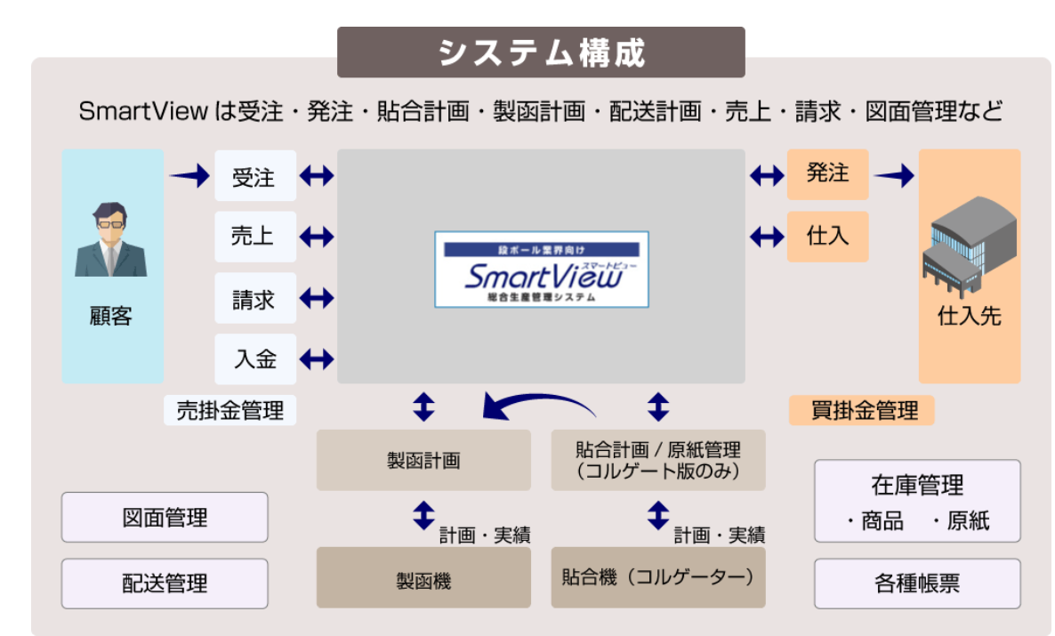 SmartViewは、段ボール業界に特化した統合型の生産・販売管理パッケージです。受注・発注から貼合・製函計画、配送計画、売上・請求、在庫管理、図面管理までを一元管理。現場との連携がスムーズになり、納期遵守・請求漏れ防止・業務の大幅な効率化を実現。コルゲーター・ボックスメーカー両対応で、Windows環境・SQL Serverに対応。与信管理やカスタマイズ機能、外部システム連携も可能な柔軟性を持つ実践的なソリューションです。