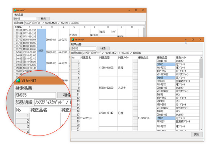 「プロモV8 for NET」は、自動車の型式情報から補修部品の品番・価格を瞬時に検索できる、インストール型の部品検索システムです。車輌情報に基づいたグルーピング、部品互換性の確認、在庫連携、見積作成、ユーザーメモ機能など、多数の便利機能を搭載。大手部品問屋の取り扱いメーカーを中心に、補修用優良部品の情報を網羅。リアルタイムな情報更新や棚番表示、特別仕様版による専用カスタマイズにも対応し、部品選定業務の効率を大きく向上させます。