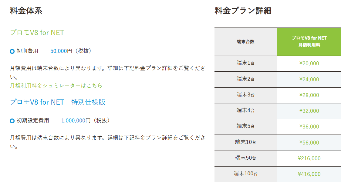 初期費用:通常版 50,000円(税抜)/特別仕様版 1,000,000円(税抜)/月額:端末数に応じて20,000円~(特別仕様版は100台で400,000円、500台で1,350,000円など)