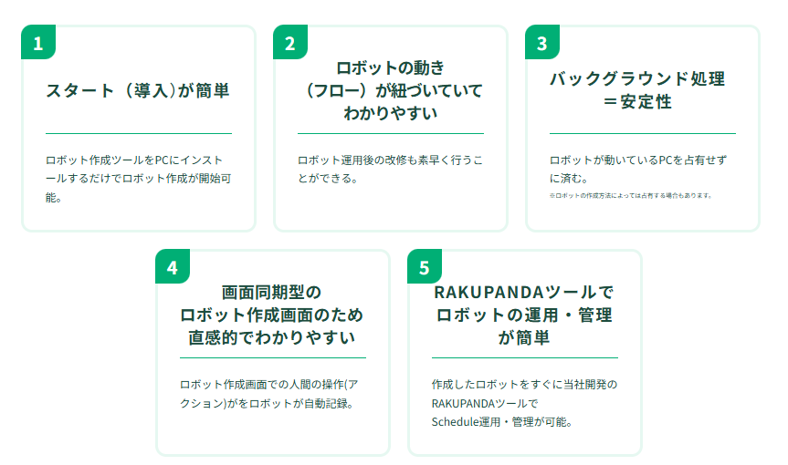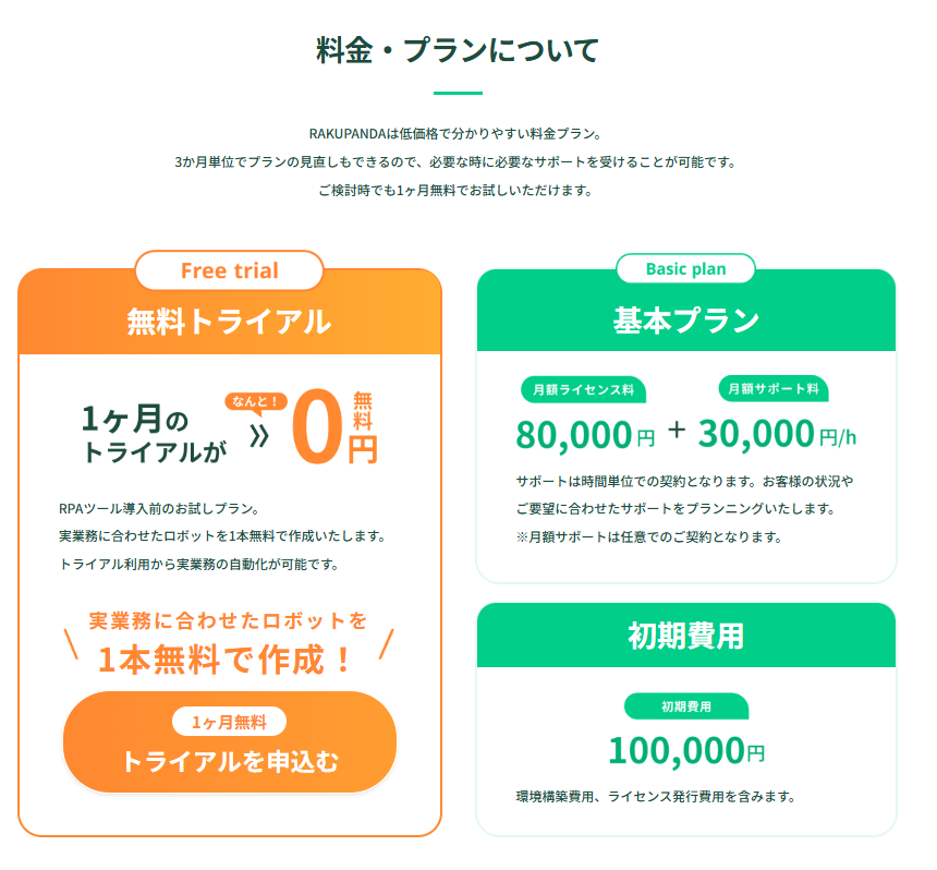 RAKUPANDAは、業務選定からロボット作成・保守まで一貫サポートを提供。ロボットは人間の操作を録画して記憶する方式で、プログラミング不要。ロボット作成後はツール上でスケジュール管理・実行が可能です。サポートは平日10時〜17時で、遠隔支援や学習サイトも完備。1ヶ月無料トライアルでは実業務に即したロボットを1本無償で提供しており、即導入・即効果が期待できます。