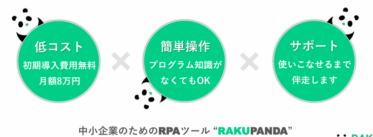 RAKUPANDAは、入力作業やデータ集計などの定型業務を代行するロボットを作成・運用できるRPAツールです。直感的な操作画面と、導入から運用までの丁寧なサポートにより、情報システム部がない企業でも安心して導入できます。メール送信やファイル操作、APIによるkintone連携なども可能で、現場業務に応じた柔軟な自動化が可能。低コストで始められ、DX化の第一歩として多くの企業で活用されています。