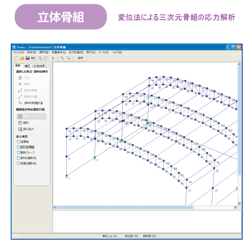 節点・部材をマウスでドラッグして簡単に作成・修正できるインターフェースを採用。番号を意識せず「この部材」など視覚的に操作でき、直感的な設計作業が可能。定形の骨組みを素早く作れる「かんたん骨組」ツールも標準搭載し、設計作業の立ち上がりもスムーズに。