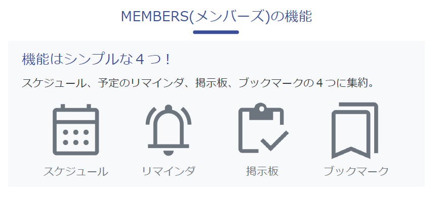 MEMBERSは、企業やチーム内のスケジュール共有に特化した行動予定表サービスです。シンプルなインターフェースと、必要最小限の機能設計により、誰でも直感的に操作可能。スマホ・タブレットからも利用でき、少人数のチームやグループでの運用に最適。ユーザーごとの独立サイトによる高いセキュリティも確保され、AWS上で安定運用されています。管理不要で、メンバー全員が自由に予定編集できるため、ストレスなく日々の予定を共有できます。