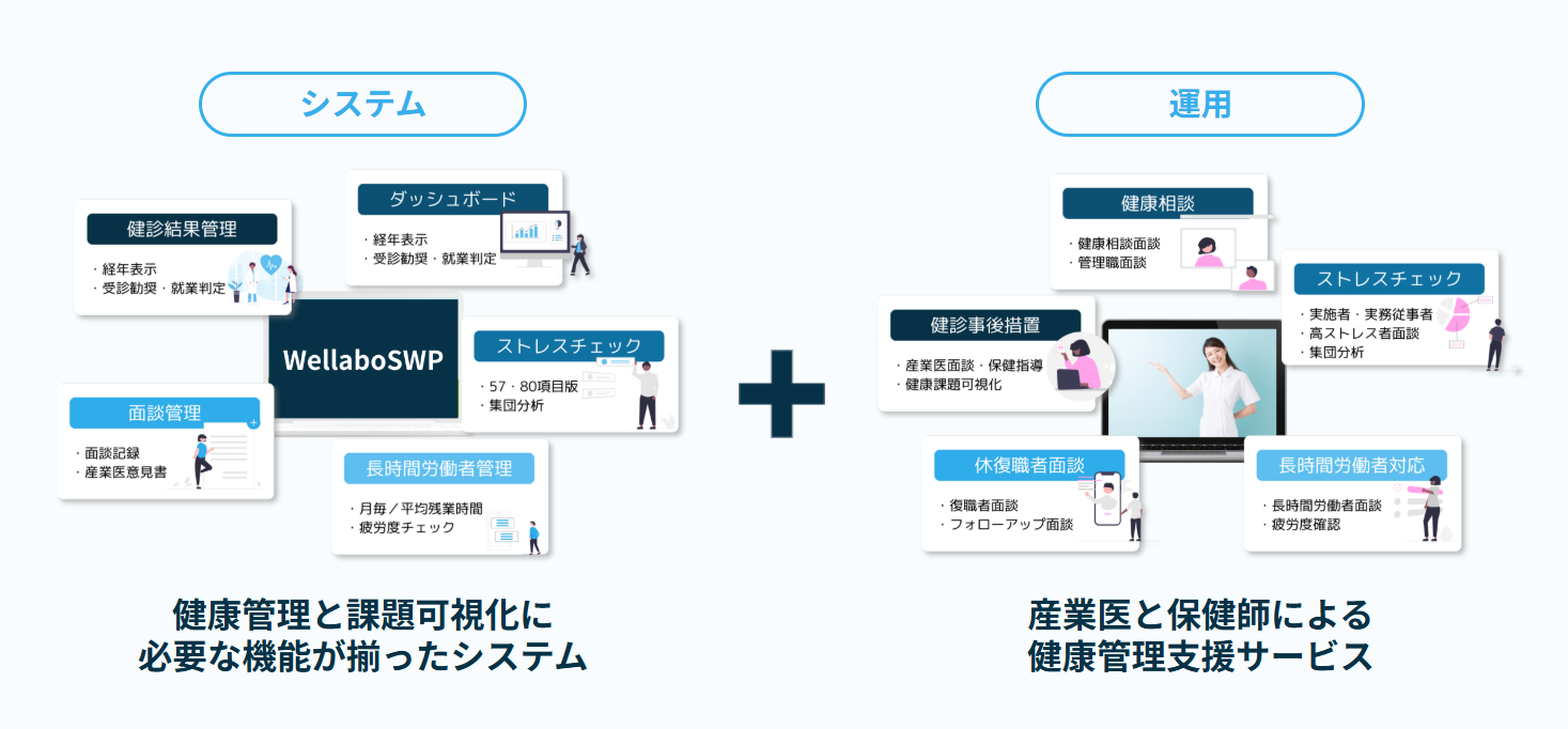 WellaboSWPは、健康診断・長時間労働・ストレスチェックなどの健康データを一元管理し、企業の健康経営を支援するクラウドサービスです。ダッシュボードでの課題可視化機能、オンライン対応の産業医・保健師連携、さらに小規模拠点への対応や英語・紙対応ストレスチェック機能も搭載。ISMS認証取得済みで、セキュリティ面でも安心です。健康経営の「実務」と「分析・改善」両方に対応し、DXによる業務効率化と従業員支援を同時に実現します。