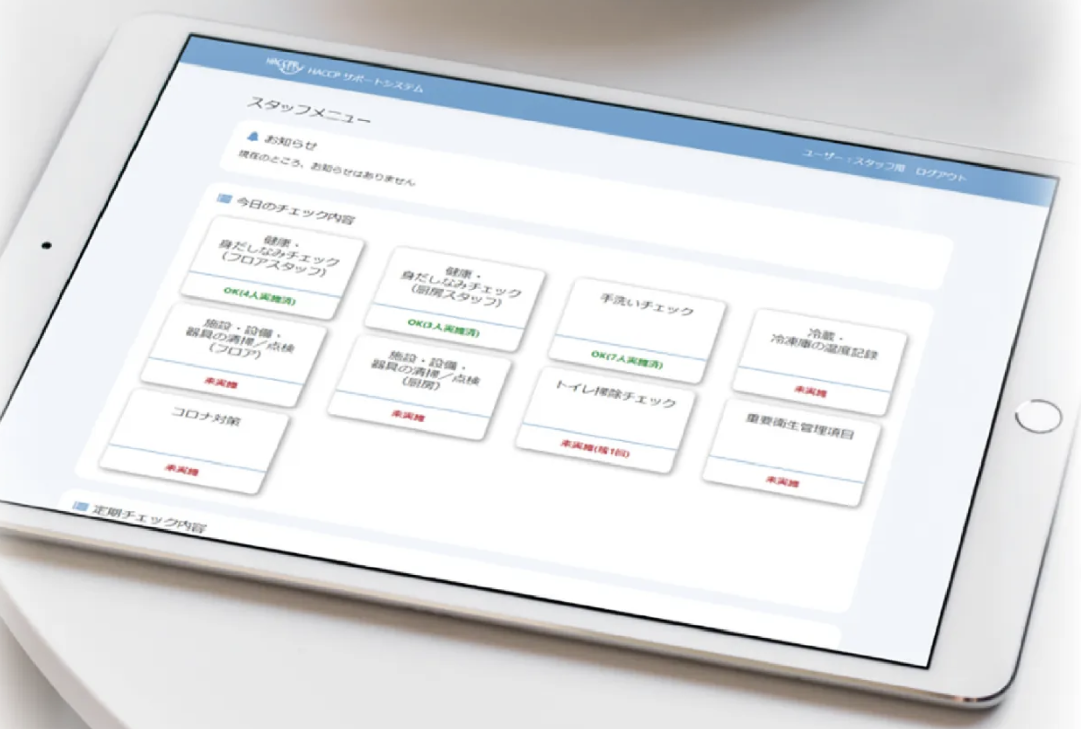 あらかじめ設計された衛生管理項目により、最小限の入力でHACCP・JFS対応の計画書作成が可能。日次のチェック記録や新型コロナ対策の記録もタッチで簡単入力。責任者による一括承認機能や、本部による月次集計・多拠点管理にも対応しています。