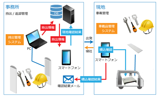 このシステムでは、車両内に積み込む物品や搭乗者の持ち物をRFIDで一括確認できます。過不足がある場合は、スマートフォンへバイブやアラームで通知が届き、忘れ物のリスクを回避。さらに、確認結果はスマホからメール送信でき、管理者への報告も容易です。移動中にも定期的に物品を確認できるため、紛失リスクにも対応可能です。