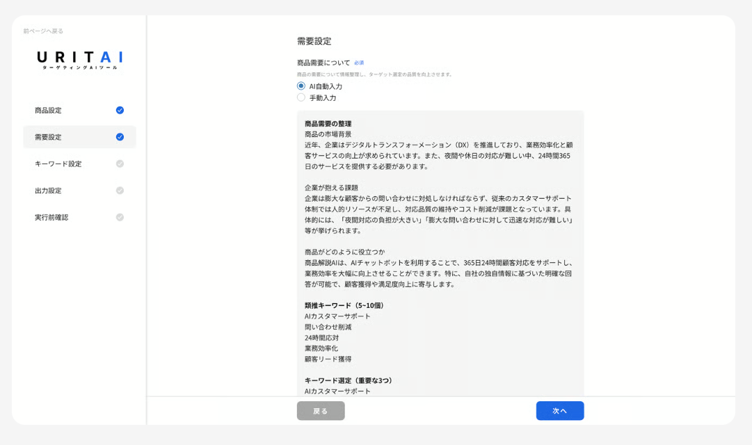 URITAIのAIターゲティング機能は、入力した自社サービスの特徴から訴求力の高いキーワードを自動生成し、最新の企業サイト情報を横断検索。今まさに課題を抱える企業をスコアリングして提示し、仮説立案や情報収集の手間を大幅に削減しつつアポイント取得までの時間を短縮します。