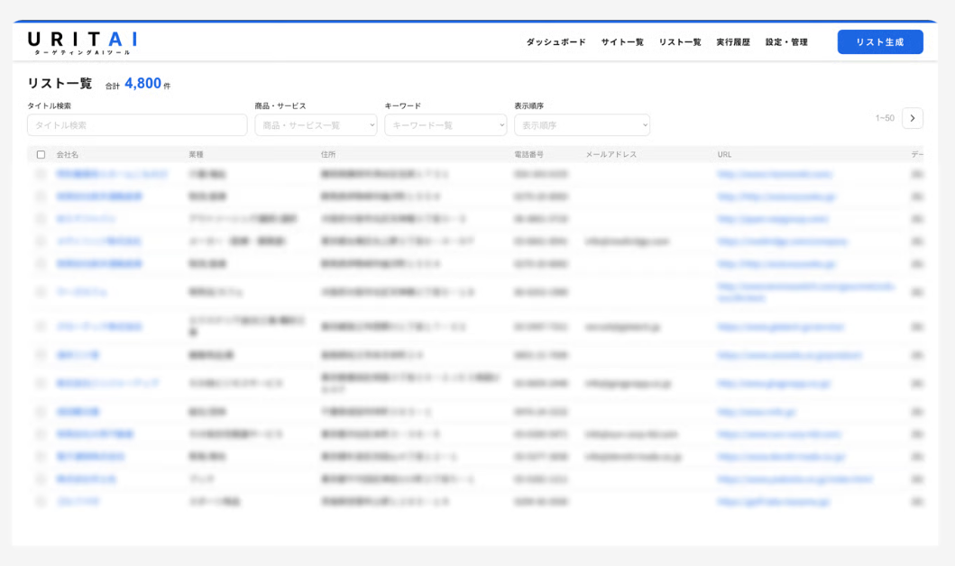 URITAIは、全国100万社超の企業サイトを独自クローラーで常時解析し、商品・サービス内容からAIが関連キーワードを抽出。サイト文脈を意味レベルで判断して潜在ニーズの高い企業だけを自動選定し、企業名・連絡先付きリストを数秒で出力できる。従来の業種・規模中心の絞り込みでは届かなかった「今すぐ必要とする企業」へのアプローチを実現する。さらに、ダッシュボード上でリスト管理やステータス更新もでき、チーム全体で情報共有を効率化。