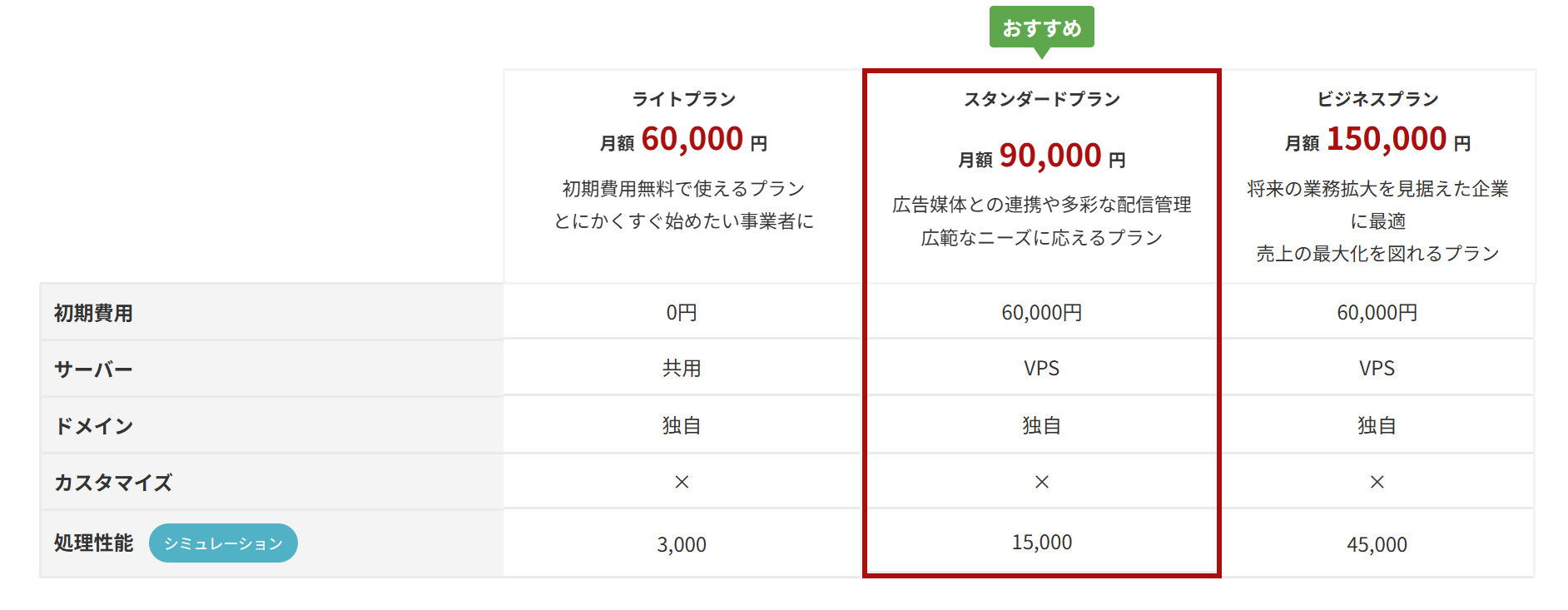 ライト:月額60,000円/スタンダード:月額90,000円/ビジネス:月額150,000円(初期費用:0~60,000円)