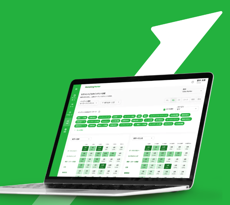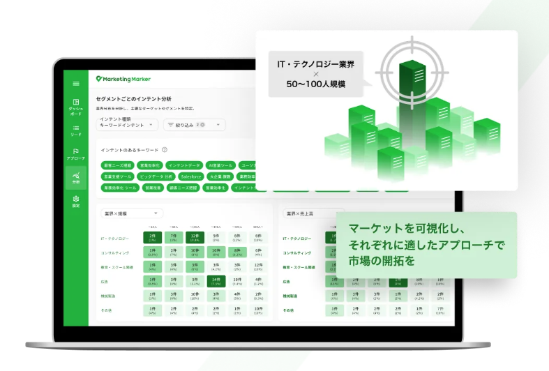 Marketing Markerは、広告・Web上の行動データをもとに顧客の興味関心(インテント)を可視化し、適切な打ち手を設計するBtoBマーケティング支援ツールです。単なるCVや受注結果に頼るのではなく、検討段階からの兆候を捉えて“誰に・何を・どこで届けるか”を導き出します。LPやポップアップ、フォームを顧客の検討フェーズに応じて自動最適化し、CVRや商談化率を向上させるナーチャリングも実現。カテゴリー戦略と組み合わせることで、成果が持続するマーケティング基盤を構築できます。