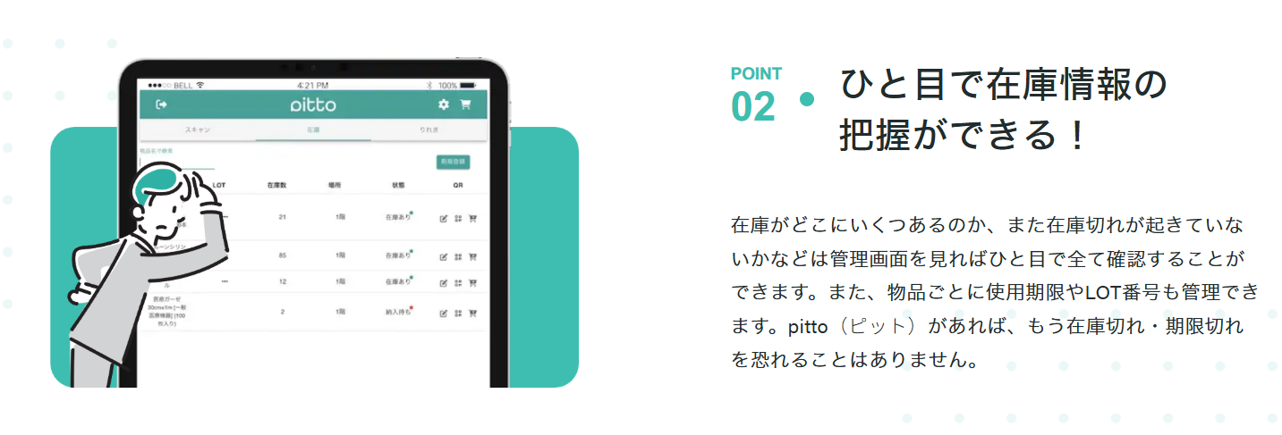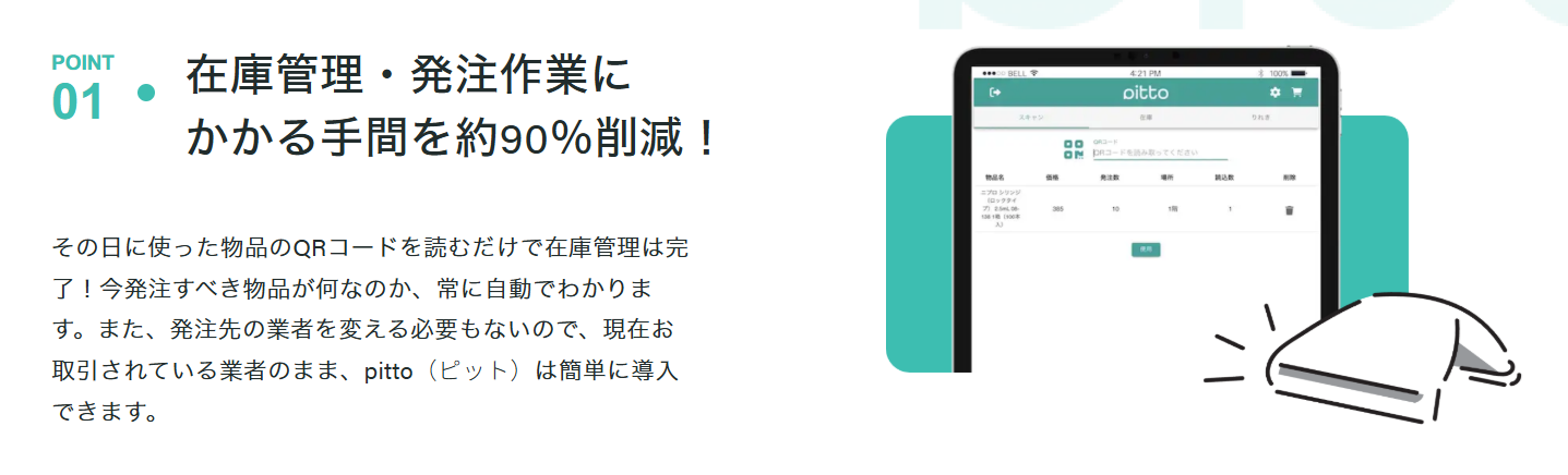pittoは、物品のQRコードを「ピッと」読み取るだけで、在庫管理から発注までを自動化します。複雑なシステム操作や入力作業は一切不要。発注先の業者もそのまま利用可能なため、導入ハードルも低く、既存の業務フローを大きく変えることなく使えます。管理画面では在庫状況や期限管理も一目で確認でき、欠品・期限切れの不安から解放されます。