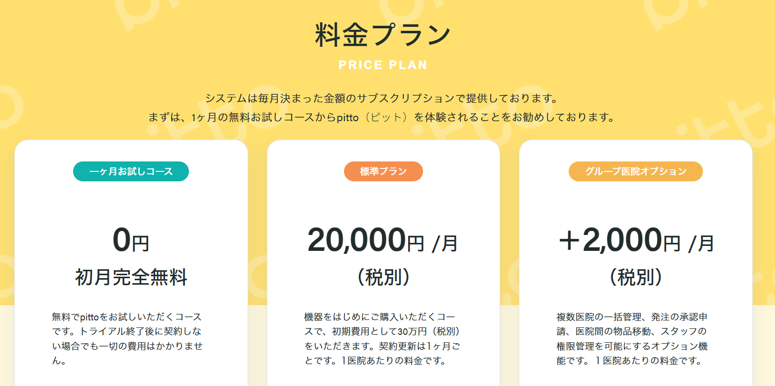初期費用30万円(税別)、月額料金:要問い合わせ、グループ医院オプション+2,000円/月(税別)、1ヶ月無料体験あり