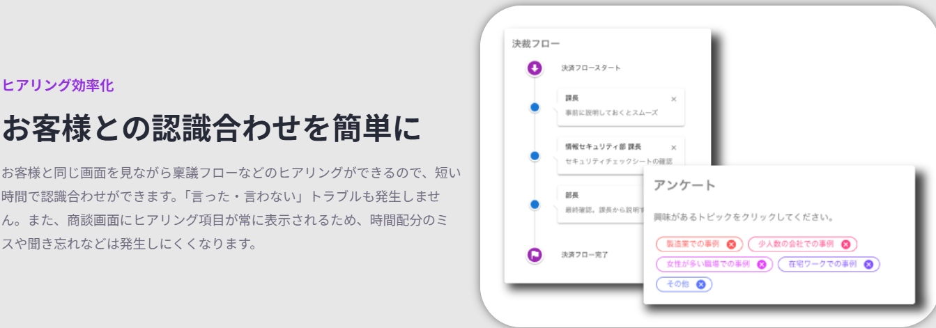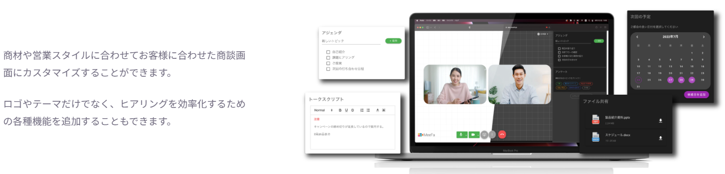 MeeFaのオンライン商談ツールは、商材に合わせた柔軟なカスタマイズが可能で、対話・資料共有・画面操作などの商談に必要な機能をシンプルに統合。営業チーム全体で使いやすく、商談品質のばらつきを抑えることができます。直感的に使えるUI設計で、導入初日から即運用可能。顧客との信頼構築に集中できる環境を提供します。