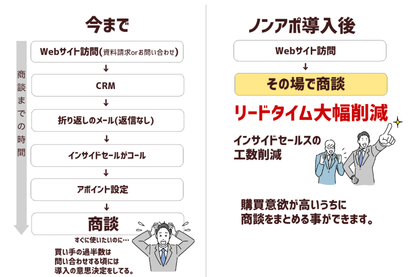 ノンアポは、WebサイトやLPにタグを設置するだけで、ユーザーが訪問したその瞬間に営業担当者と商談を開始できるツールです。カレンダー連携で空き時間を自動反映し、バッティングのないスムーズな対応が可能。資料請求やフォーム送信を介さず、その場でミーティングを始められるため、リードの熱が冷める前にコンバージョンへつなげることができます。営業現場の「すぐ話したい」に応える即応ツールです。