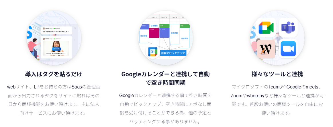 クラウド型Webサービス、PC・スマートフォン対応、Googleカレンダー連携、Zoom/Teams/Wherebyなどに対応、タグ設置型