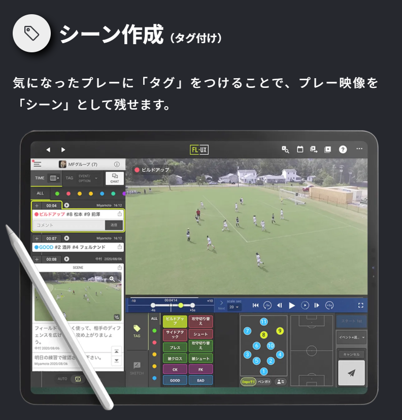FL-UXは、スポーツチームのプレー映像に直接描き込み(スケッチ)を行ったり、特定のプレーシーンを抽出してプレー集を作成したりできる映像分析アプリです。映像を通じて選手に的確なフィードバックを行い、理解度や再現性を向上。育成年代からトップチームまで、戦術理解や個別指導を深めるツールとして幅広く活用されています。