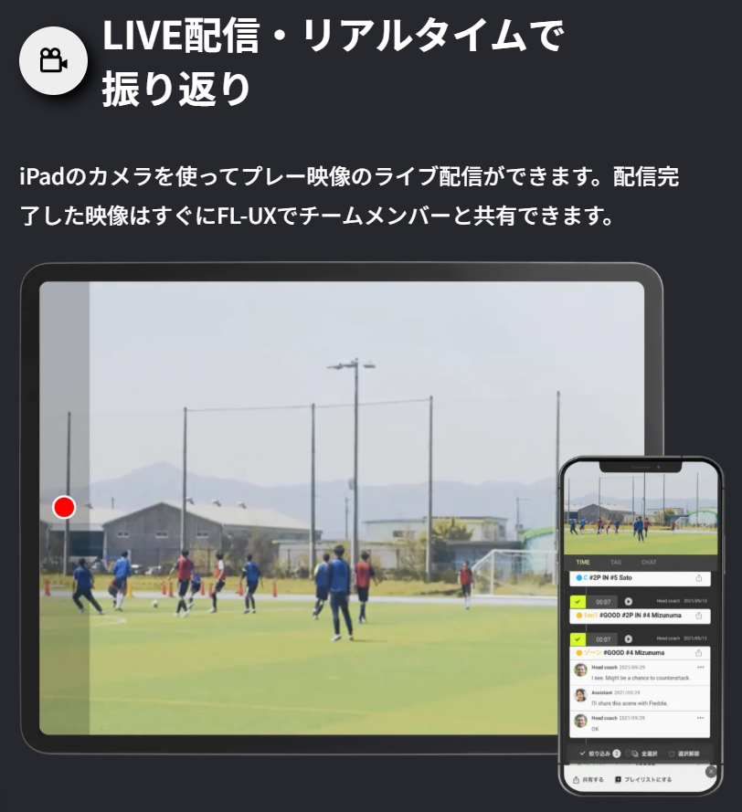 FL-UXは、スポーツチームの映像を活用して、指導・育成・戦術分析・チーム強化を支援する映像分析・編集・共有アプリです。サッカー・バスケットボール・ラグビーなど200以上の国内外チームに導入されており、プレー映像のスケッチやプレー集の作成、チャットによるフィードバックなどを通じて、コーチと選手間のスムーズなコミュニケーションを促進。選手ごとの映像分析や戦術解説も可能で、映像ベースの客観的かつ効果的な育成をサポートします。