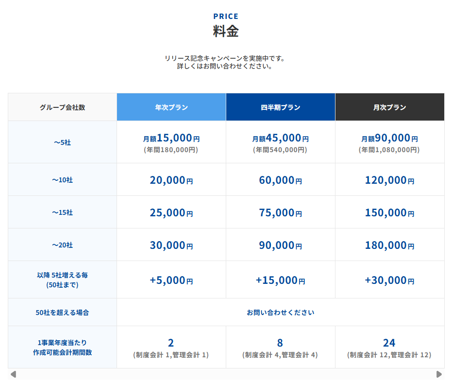 月額15,000円〜(年次プラン/5社以下)、ユーザー数無制限、初期費用は別途見積り