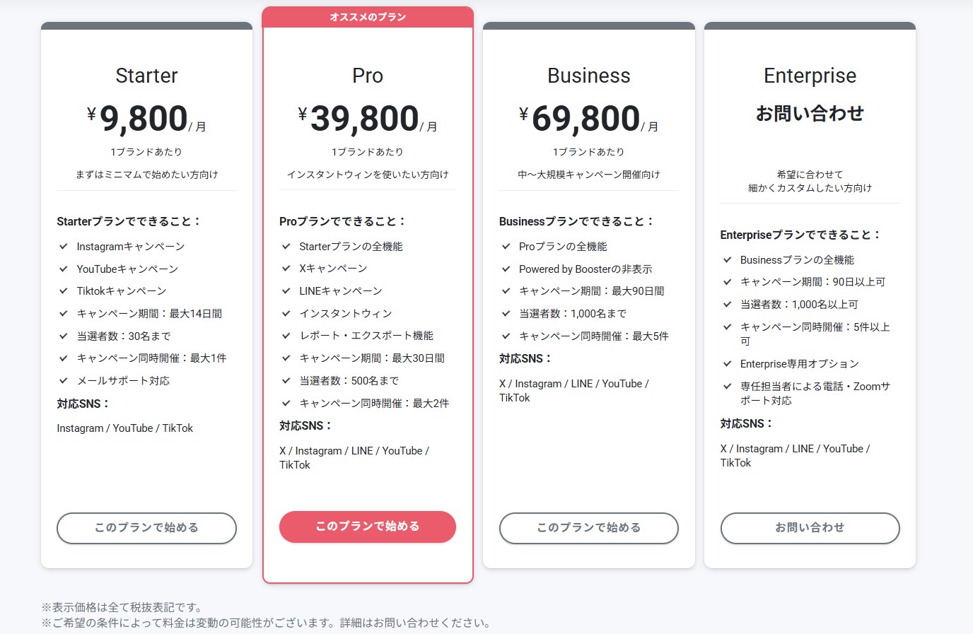 Boosterは、X(旧Twitter)、Instagram、LINE、YouTubeに対応したSNSキャンペーンのオールインワン運用プラットフォームです。フォロー&リポスト、インスタントウィン、シリアルナンバー抽選、ギフト発送など20種類以上の応募アクションに対応。誰でも簡単に専用ダッシュボードからキャンペーン作成・運用が可能で、LPも自動生成。データ分析機能やクロスプラットフォーム対応なども備え、個人から企業まで幅広く活用されています。