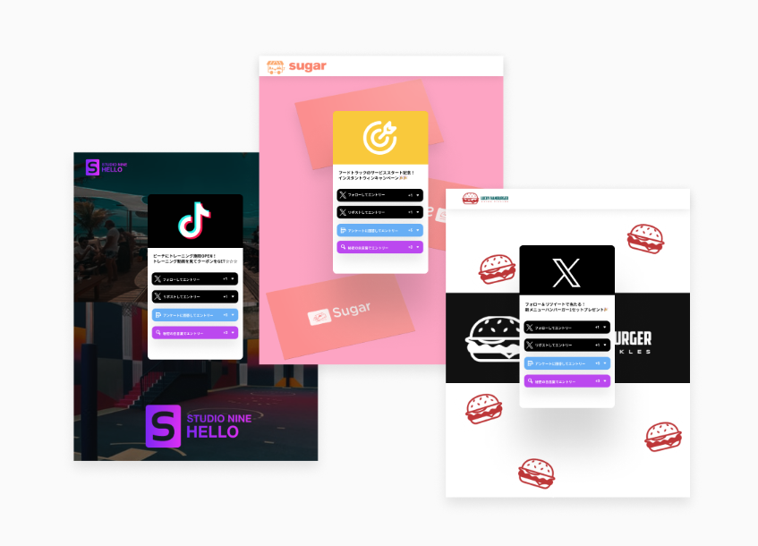 Boosterには、フォロー、リポスト、動画視聴、クイズ、アンケート、結果予想など20種類以上の応募アクションがあり、目的に応じた自由な設計が可能です。公式API準拠でのリポスト・フォローチェック、クロスプラットフォームでのキャンペーン実施、ユーザー分析やギフト配布までを一貫サポート。ブランドのSNSマーケティングを効率化し、成果に直結する運用が行えます。