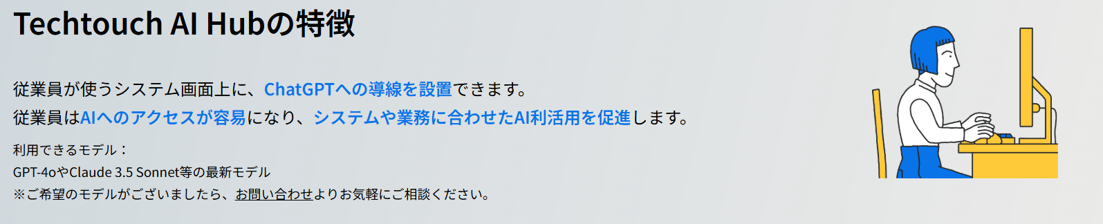 Techtouch AI Hubは、ChatGPTやClaudeなどの最新生成AIを、既存の業務システムに“あと乗せ”で導入できるノーコードのソリューションです。ブラウザ拡張機能を使い、システム画面上にAI導線を配置することで、改修不要・即時導入が可能。AIとの自然な対話・業務に即した回答、利用状況の可視化などにより、業務現場のAI利活用を促進。シングルサインオン対応や役職ごとのアクセス制御も搭載し、企業のITガバナンスとも両立します。