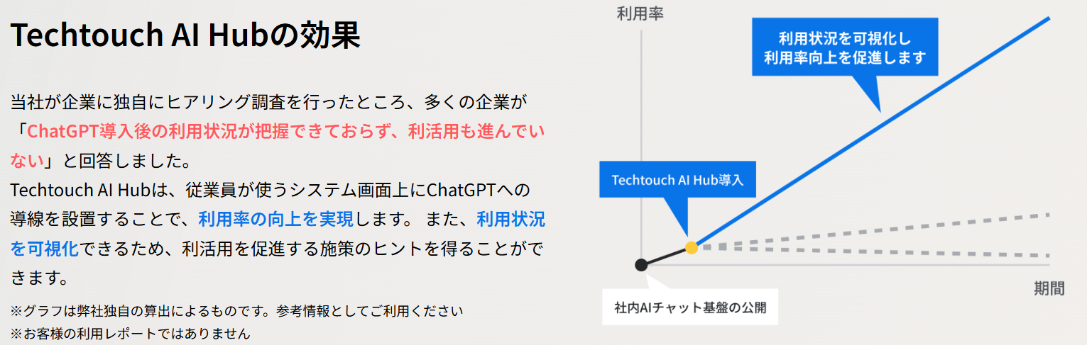 Techtouch AI Hubは、社内で使われるSaaSや業務システムに、ChatGPT等のAI機能をノーコードで簡単に組み込むことができるプラットフォームです。システム改修やエンジニアリソースを必要とせず、ユーザーの操作画面上に直接AI導線(ボタンなど)を設置可能。これにより、従業員は日々の業務の中で自然にAIを活用でき、導入・教育コストも最小化されます。