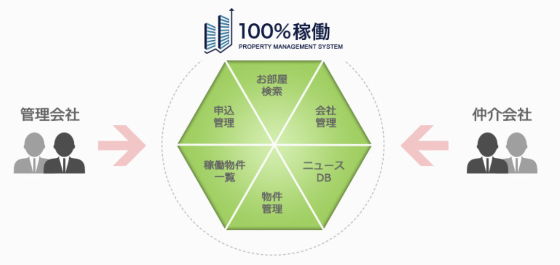 「100%稼働」は、不動産管理会社と仲介会社をつなぐクラウド型のB2B情報流通システムです。空室、AD情報、案内情報などをタイムリーに共有でき、初期費用の自動計算や24時間見積書発行など営業活動を効率化。スタッキング表で稼働状況を一目で確認可能。管理会社と仲介会社それぞれに最適化された機能群を搭載し、募集・申込・審査の一連の流れを一元管理。CSV取込や既存システムとの連携にも柔軟に対応しています。