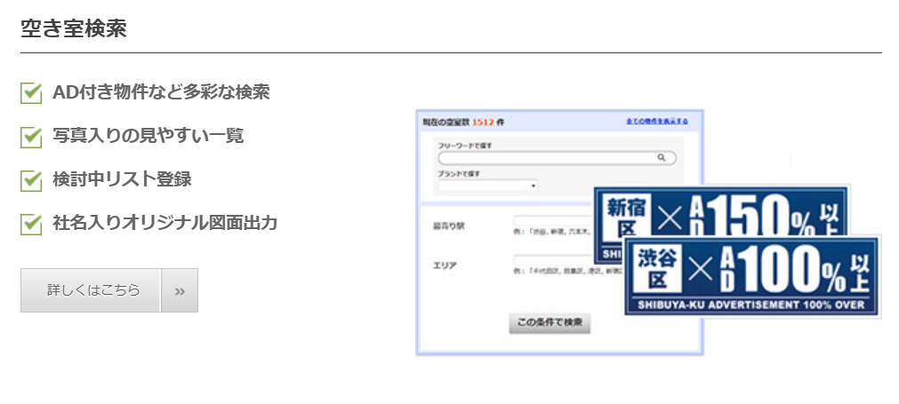 「100%稼働」は、仲介会社に対して空室情報、AD情報、案内スケジュールをリアルタイムで提供可能。初期費用の自動計算機能と見積書の24時間自動発行により、問い合わせ対応や社内処理の手間を削減します。写真付き物件一覧やAD条件での絞り込み、オリジナル図面の出力機能など、営業支援ツールとしての機能も充実。