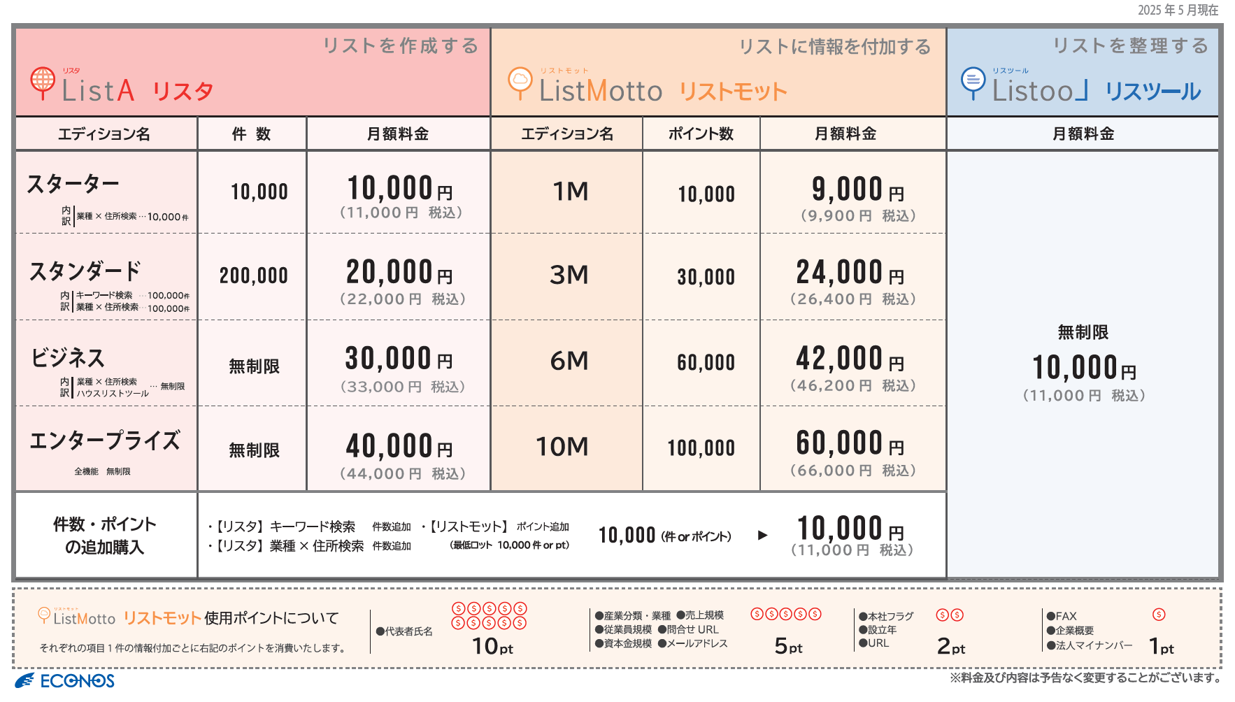 ・リストを作成する「リスタ」 WEB上の様々な情報から、キーワードに応じた企業リストを自動作成します。 ・リストを整理する「リスツール」 アクセスやDB関連の知識は不要で、企業リストの整理・マッチ・活用が簡単にできます。 ・リストに情報を付加する「リストモット」 電話番号をキーに会社規模や概要等の項目を追加し営業効果を高められます。