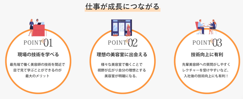 美容室オーナーは、掲載料・成果報酬・初期費用すべて0円で人材を確保可能。学生と気軽にマッチングでき、短期的な人材不足の補填から将来の正社員採用まで幅広く活用できます。メッセージ機能により簡単に日程調整ができ、トライアル雇用のハードルを大幅に下げます。