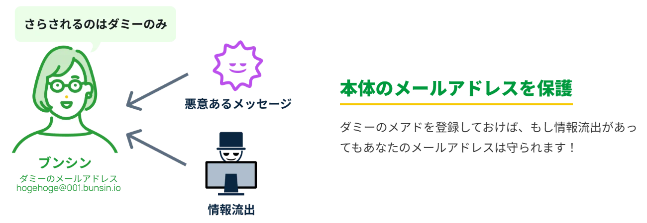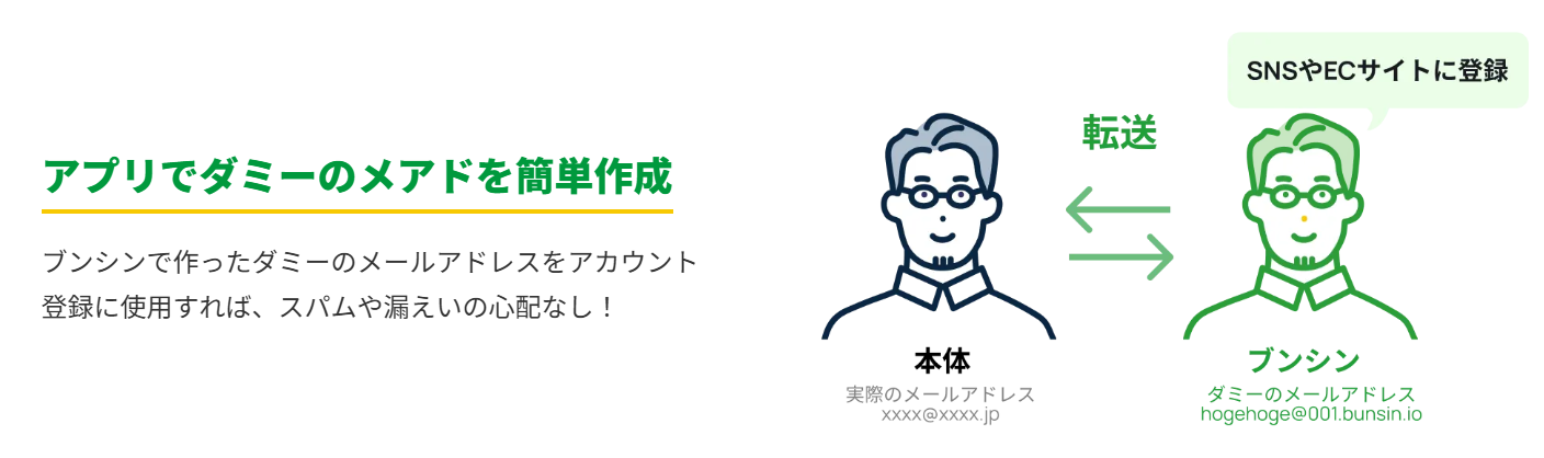 Bunsinは、サービス登録やアカウント作成時に使用できる「身代わりメールアドレス」を即時作成できるアプリです。複数のダミーアドレスを用途ごとに使い分けることで、本来のメールアドレスがスパムや漏洩の対象になるのを防ぎます。登録した覚えのないメールが届いた場合は、情報流出の検知にもつながり、リスク管理にも貢献します。匿名返信や転送オフ設定も可能で、安心してやり取りができます。