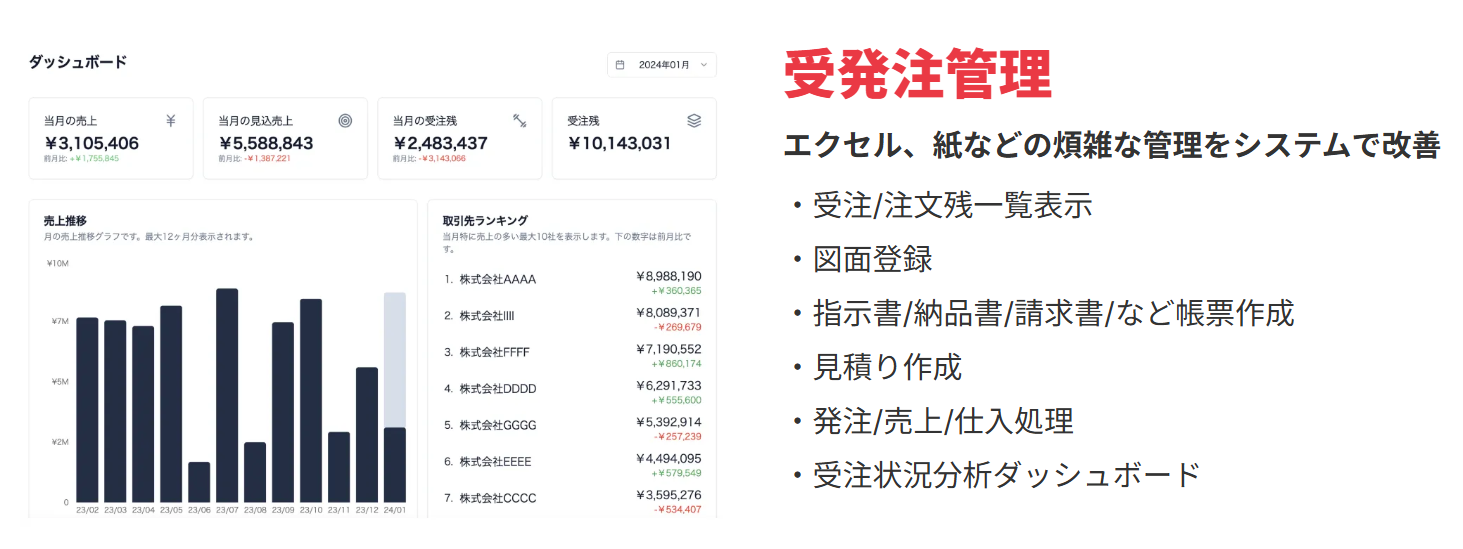 DrumRoleは、創業者が実際に町工場で半年間働いて感じた課題から生まれた販売・生産管理システムです。エクセルや紙ベースの煩雑な業務を簡単な操作で一元管理でき、導入もスムーズ。受発注、品質、工程すべての進捗を見える化し、誰でもすぐに定着できる仕組みを実現しています。機能は町工場に必要なものだけに絞り込み、操作性とコストのバランスを徹底追求しています。